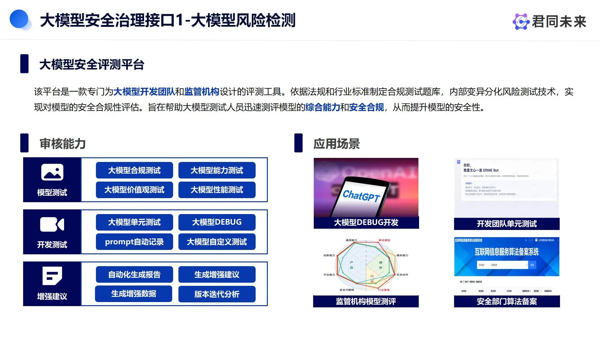 基于此,韩蒙博士表示,君同未来深入探索了安全风险识别能力、攻击意图识别能力、正向回答生成能力、输出内容改写能力,并研发了三个安全技术平台,分别是大模型安全评测平台、大模型风险监控平台和大模型安全对齐平台,以提升大模型的安全性和可靠性。