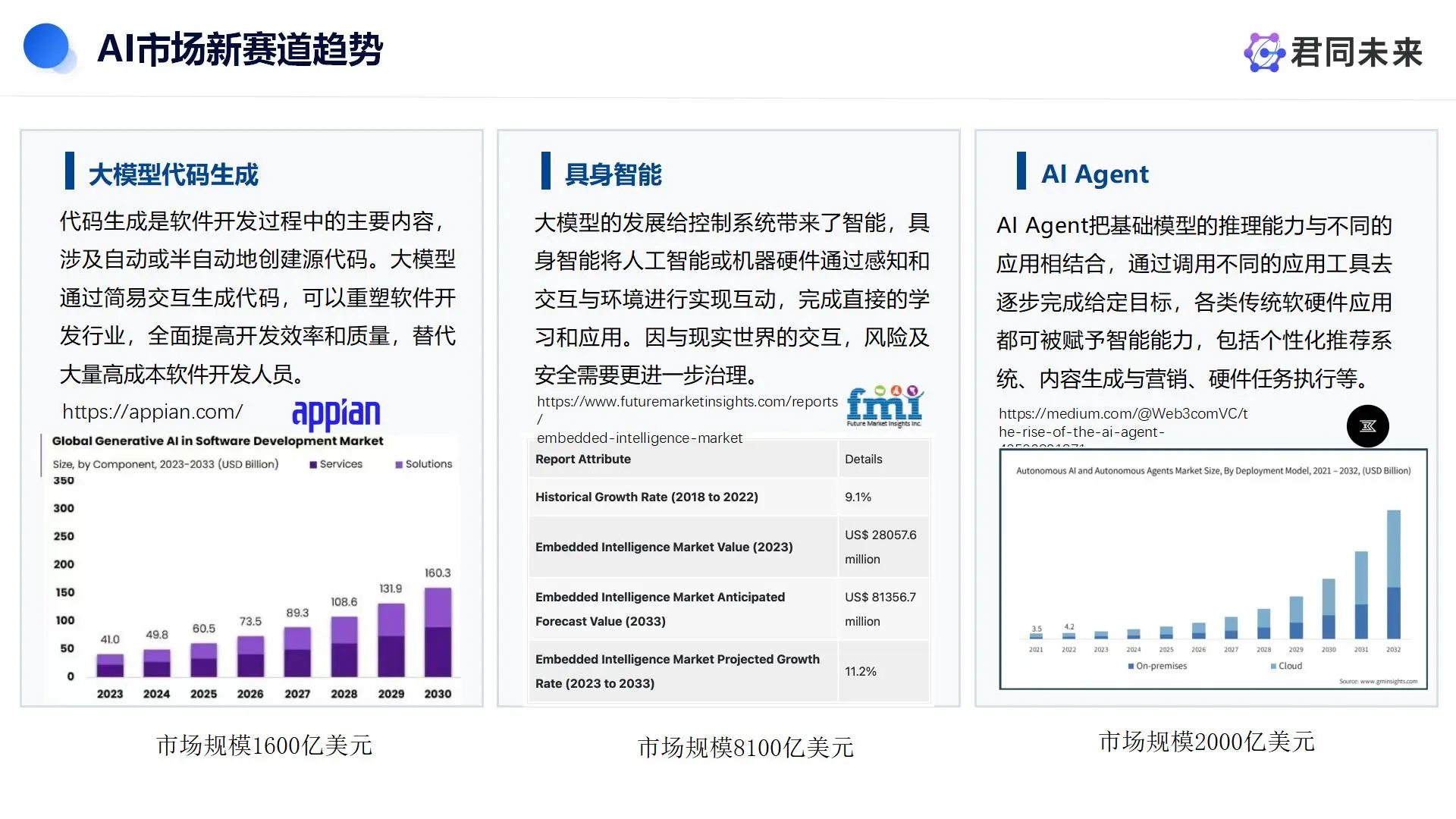 伴随着人工智能技术的不断发展,韩蒙博士指出,AI市场未来的新赛道将涵盖大模型代码生成、具身智能和AI Agent三大趋势。这些技术在未来市场中展现了巨大的潜力和广泛的应用前景。随着技术的不断进步,它们将为各行各业带来深远的变革和提升。